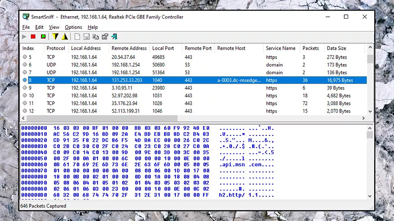 در SmartSniff میتوانید انواع ورودیها، پورتها، آداپتورهای شبکه و سرویسها را انتخاب کرده و ترافیک لحظهای آنها را رصد کنید. اجرای چند دقیقه این ابزار کافی است تا آگاهی کاملی بر ترافیک شبکه سرویسها و برنامههای خود پیدا کنید.
