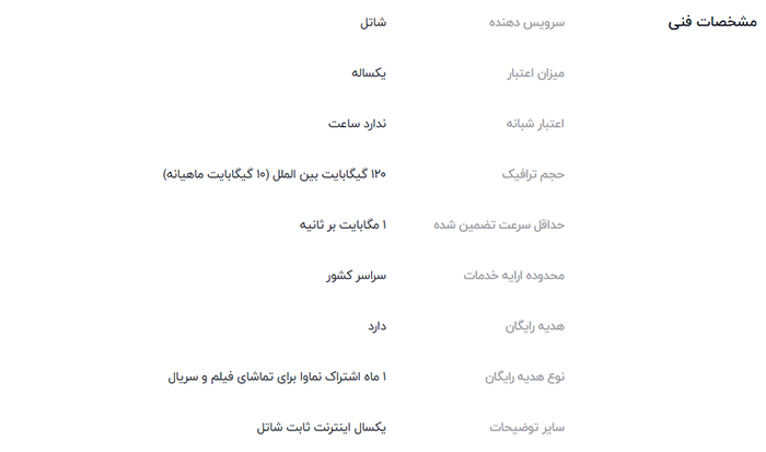 وقتی نگاهی به مشخصات محصول این سرویس اینترنت میاندازم؛ به نظرم هنوز بسیاری از اطلاعات برای کاربران عادی درج نشده است و میتواند گمراهکننده باشد. کاربر باید بدانید سرویس اینترنت ADSL قرار است روی خط تلفن او ارائه داده شود و همینطور پس از اتمام حجم میتواند این سرویس را تمدید کرده یا ترافیک اضافه بخرد. به علاوه، در این مشخصات میزان ترافیک داخلی درج نشده است.