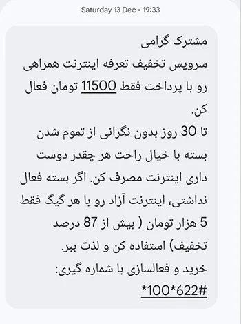 در چند وقت اخیر، همراه اول با ارسال پیامکهایی به مشترکان، ازشان دعوت میکند «سرویس تخفیف تعرفه اینترنت همراهی» را با هزینهای پایین فعال و برای یک ماه اینترنت نامحدود با تخفیف ویژه استفاده کنند.