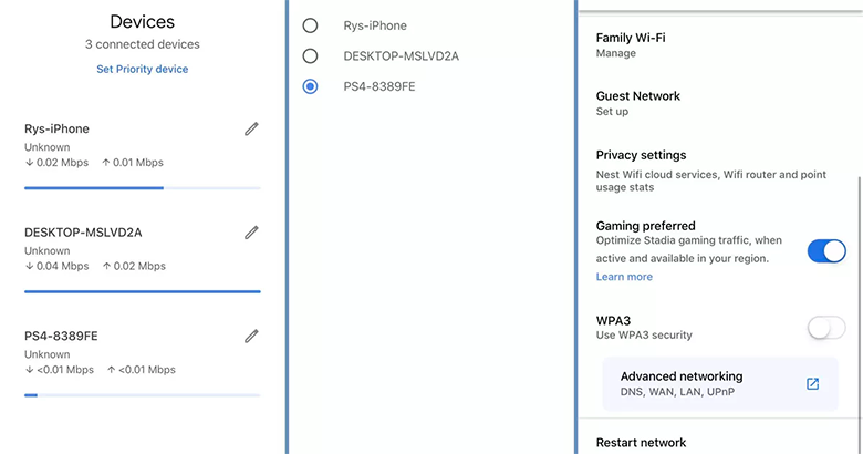 برای مثال، اگر از روتر گوگل Nest Wi-Fi در یک شبکه مش وایفای استفاده میکنید؛ میتوانید اپلیکیشن Google Home را روی گوشی خود باز کرده و روی برگه Wi-Fi بزنید و سراغ گزینه Set priority device در بخش Devices بروید. به یاد داشته باشید که میتوانید اولویت را فقط به یک دستگاه و برای زمان محدودی بدهید.