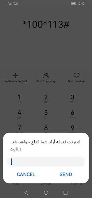 ۲- پنجرهای باز میشود و میپرسد اگر میخواهید اینترنت تعرفه آزاد شما قطع شود؛ عدد ۱ را وارد کنید.