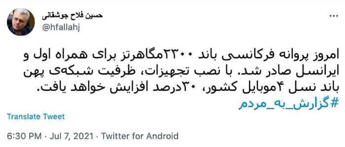 «حسین فلاح جوشقانی» در توییتی نوشت: «امروز پروانه فرکانسی باند ۲۳۰۰ مگاهرتز برای اپراتورهای همراه اول و ایرانسل صادر شد. با نصب تجهیزات، ظرفیت شبکه پهن باند نسل ۴ موبایل کشور ۳۰ درصد افزایش خواهد یافت.»