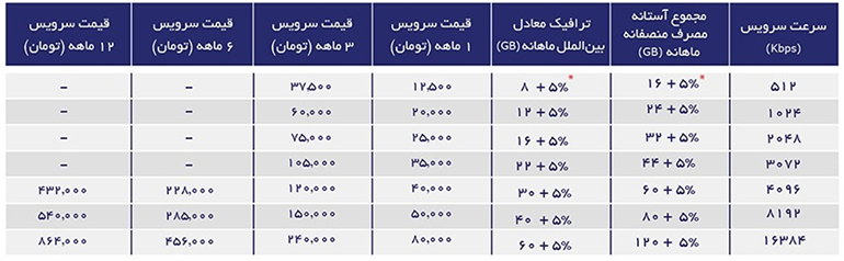 یک طرح، اینترنت ۱۶ مگابیت یک شاله با ۱۸۰۰ گیگابایت اینترنت داخلی معادل ۹۰۰ گیگابایت اینترنت بینالملل و ۹۰۰ گیگابایت اینترنت شبانه هدیه به قیمت ۷۵۰ هزار تومان است.