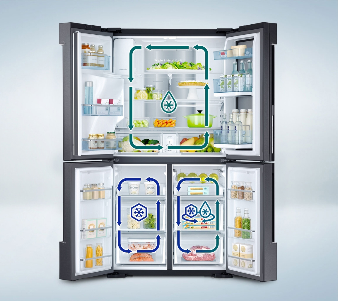 به طور معمول مواد غذایی هر چه بیشتر در داخل یخچال بماند میزان کیفیت بافت و طعم آن هم کم و کمتر میشود و در مواردی حتی بوی مواد غذایی دیگر را به خود جذب میکند. اما یخچال و فریزرRF56 با سیستم سرمایشی سهگانه به بهینهسازی دما و رطوبت کمک کرده و از ترکیب شدن بوها جلوگیری میکند تا طعم و تازگی مواد غذایی به حداکثر ممکن برسد. در این سیستم، هوای سرد به طور مستقل وارد محفظههای یخچال و فریزر میشود و با به حداکثر رساندن رطوبت از ترکیب شدن بوی مواد در هر یک از بخشهای یخچال جلوگیری میکنند.