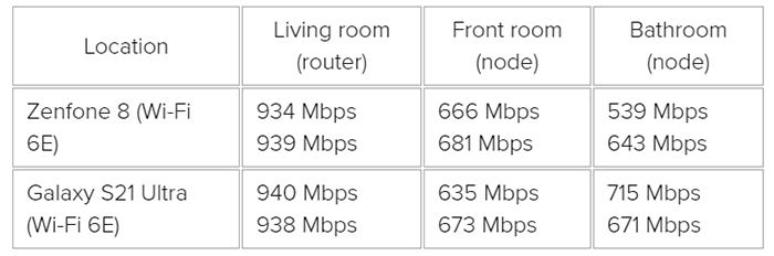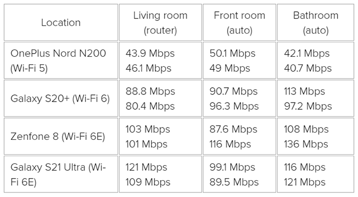 نتایج تستهای سایت اندرویدسنتر روی فرکانس ۶ گیگاهرتز (۱۶۰ مگاهرتز) و در یک اتاق: