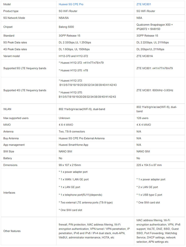 هواوی 5G CPE Pro در برابر زدتیای MC801: مشخصات