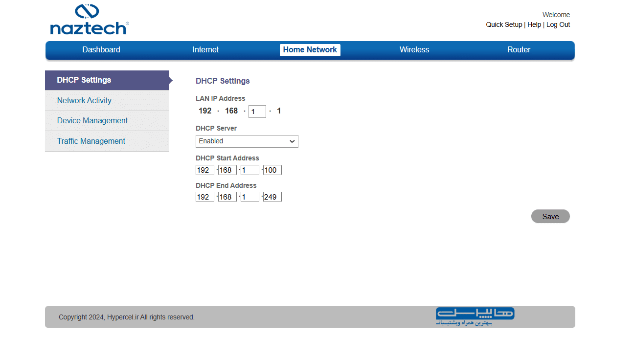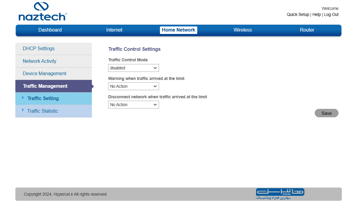 در منوی home Network با تنظیمات DHCP، فعالیت شبکه و وضعیت دستگاههای متصل و مدیریت ترافیک دیتا روبرو هستیم: