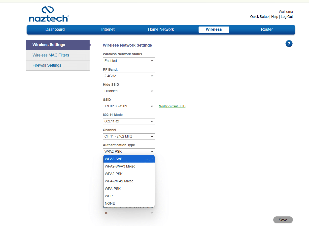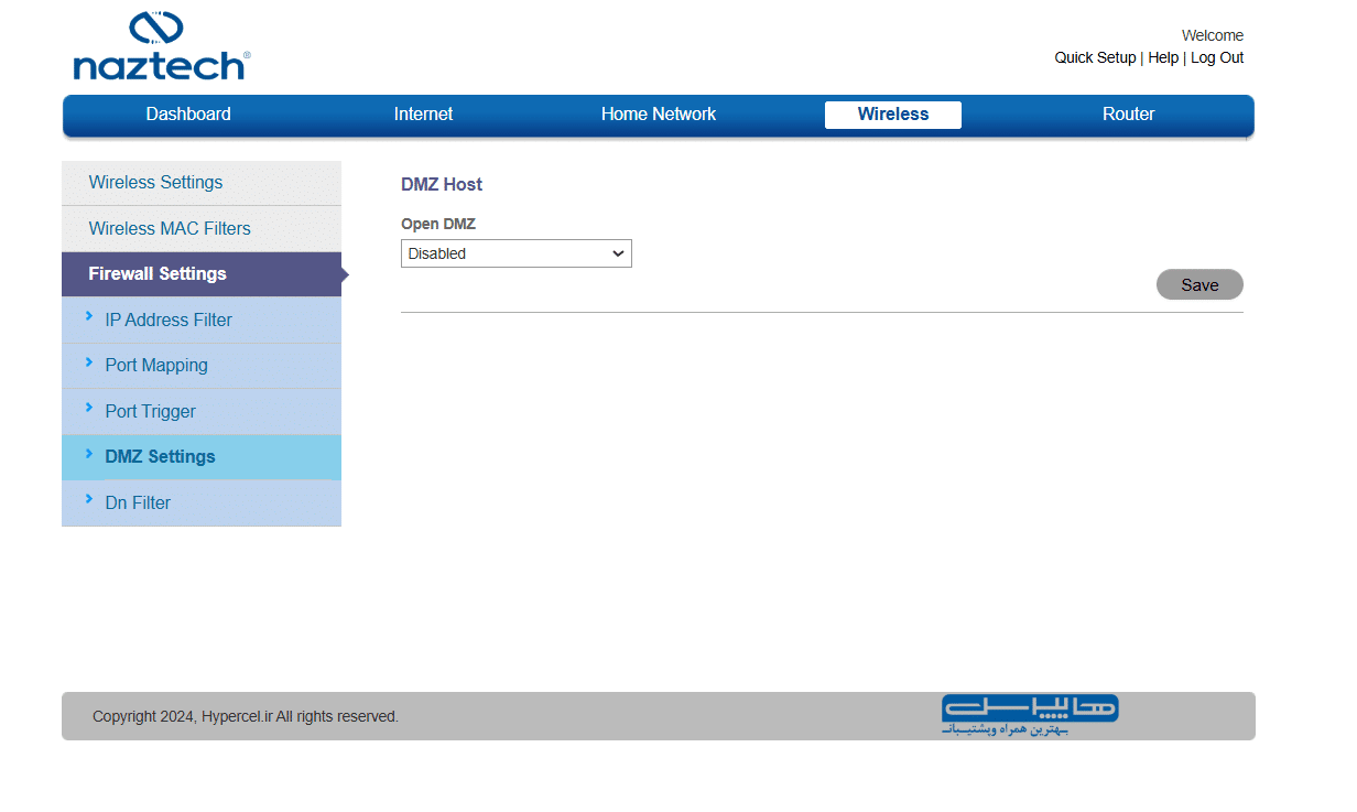 از منوی Wireless مشخص است برای مدیریت شبکه وای فای و تغییر رمزعبور، باند فرکانسی وای فای و … استفاده میشود. فیلتر آدرس مک و تنظیمات فایروال هم در این منو هستند: