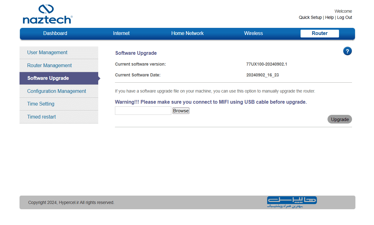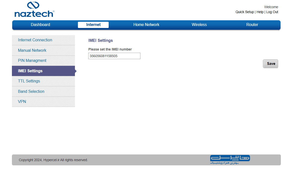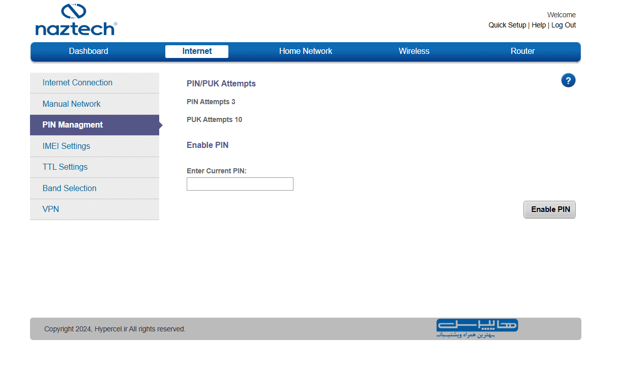 از لوگوی هایپرسل و توضیحات کپیرایت مشخص است که با یک پنل مدیریتی سفارشیسازی شده برای شرکت هایپرسل روبرو هستیم؛ لوگوی و اطلاعاتی که در فوتر تمام صفحات این پنل مشاهده میکنیم.
