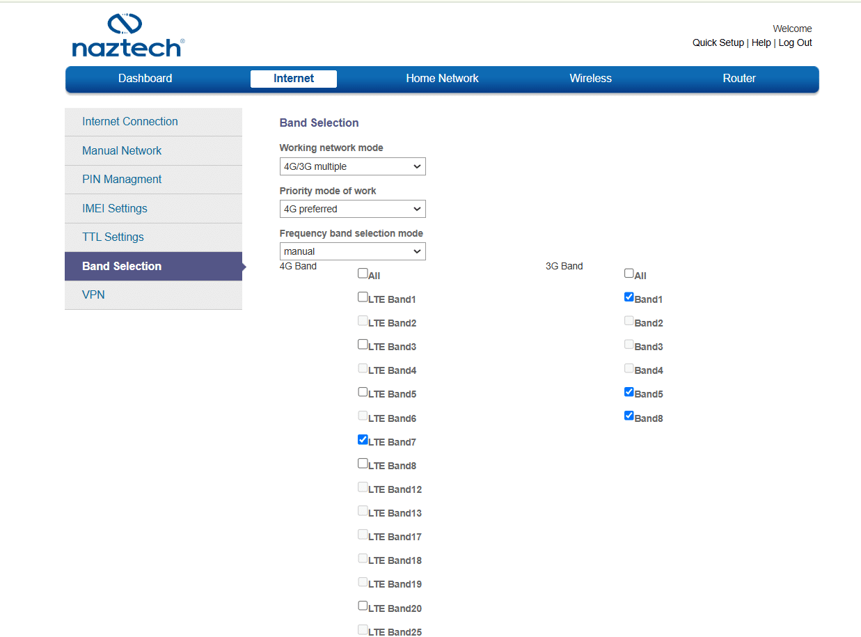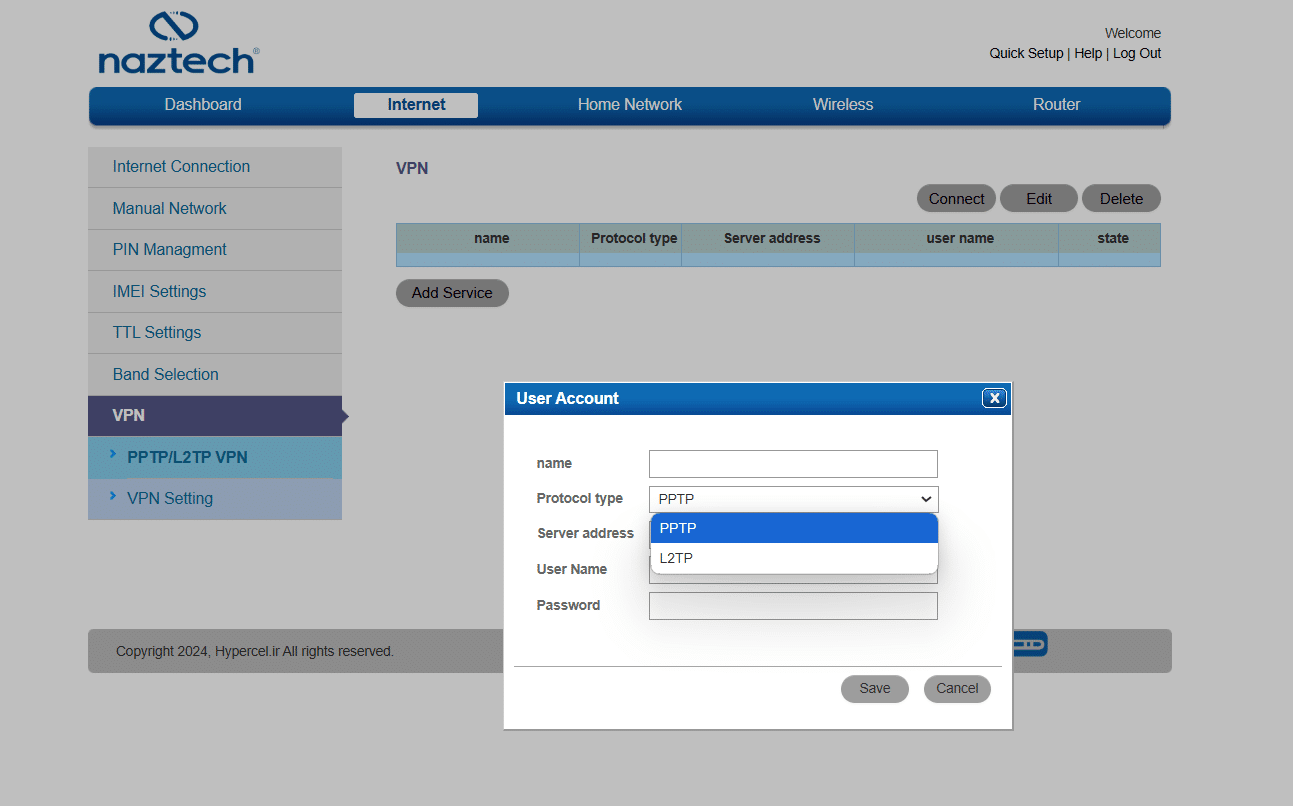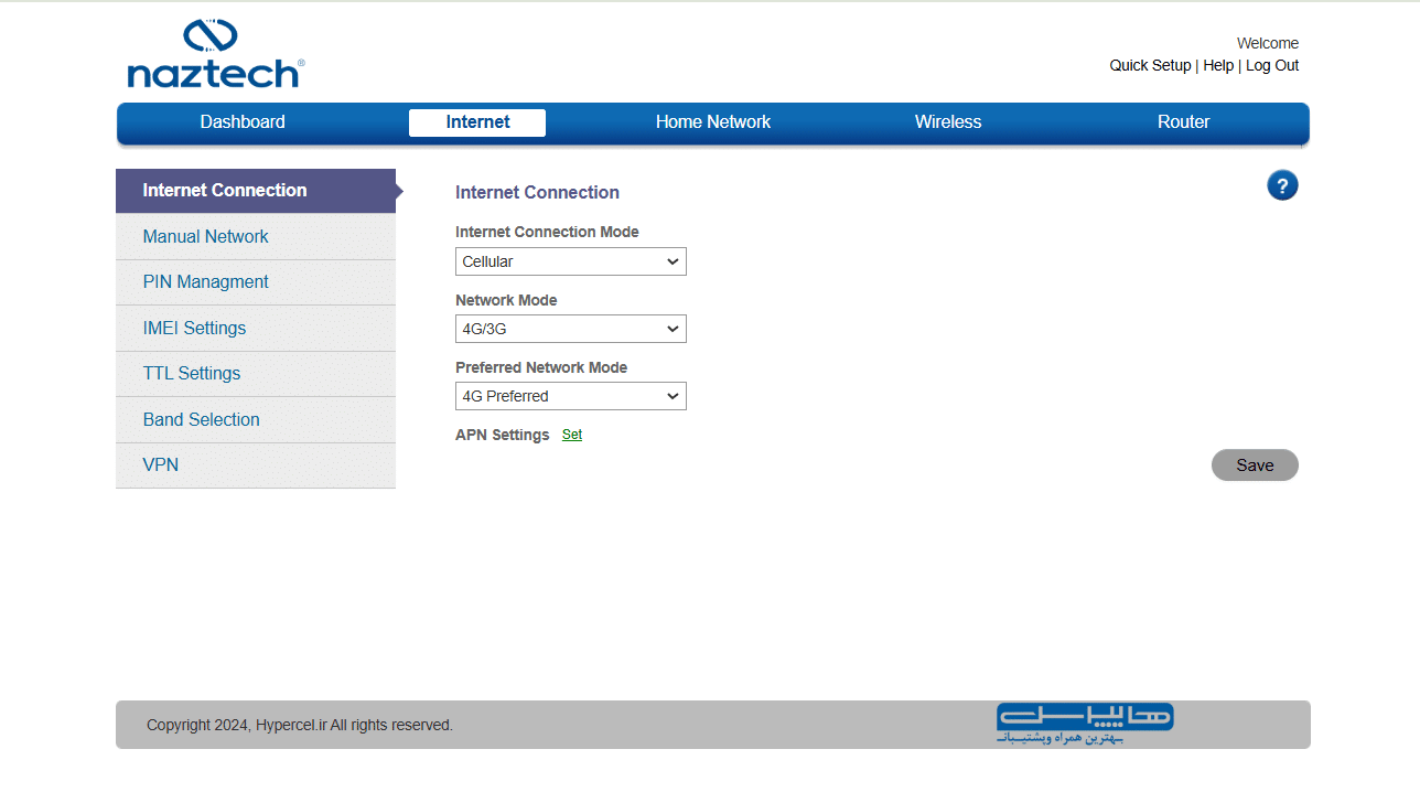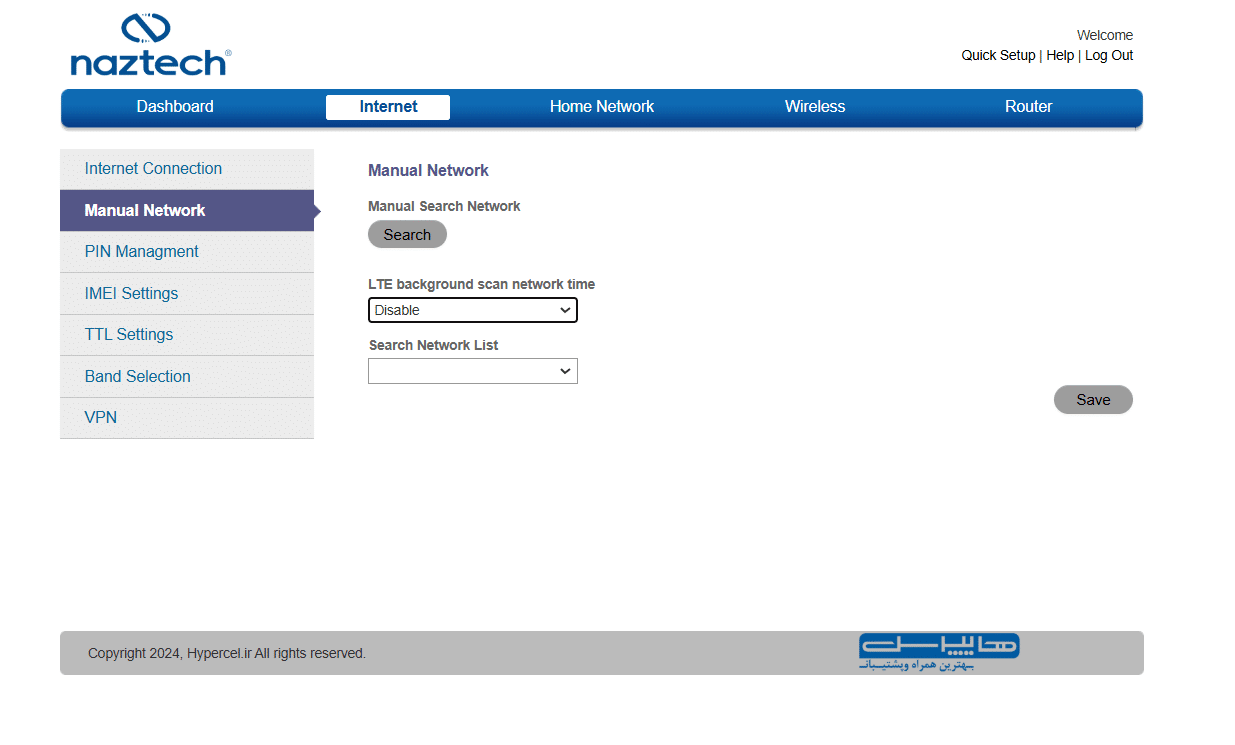در منوی Internet میتوان تنظیماتی مانند نوع شبکه، مدیریت APN، جستوجوی دستی شبکه، انتخاب دستی باند رادیویی و نهایتا تنظیمات وی پی ان PPTP و L2TP را بیابید: