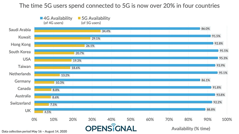 اوپنسیگنال گزارشی از وضعیت اینترنت 5G در ۱۲ کشور منتشر کرده است. سرعتهای میانگین حاصل جمعآوری دادهی آزمایشهای هر کشور در دورهی زمانی از ۱۶ مه تا ۱۴ آگوست است.